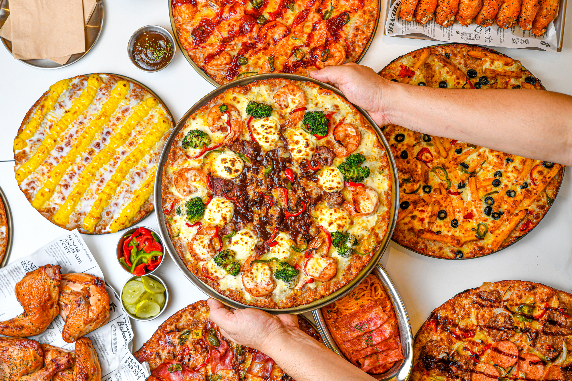 콘치즈피자 10,900 | 프리미엄스테이크피자 15,900 | 지구식단직화피자 12,900 | 크림치즈꽈배기 5,900 | 스리라차마요소스 500 | 치즈피자 8,900 | 페퍼로니피자 9,900 | 콤비네이션피자 10,900 | 고구마피자 10,900 | 핫치킨피자 10,900 | 불고기피자 11,900 | 포테이토피자 11,900 | 나폴리피자 12,900 | 고르곤졸라피자 12,900 | 까르보네피자 12,900 | 아이리쉬포테이토피자 12,900 | 불닭고구마피자 13,900 | 트러플머쉬룸피자 13,900 | 트러플포테이토피자 13,900 | 야채퀘사디아피자 13,900 | 치킨퀘사디아 13,900 | 비프퀘사디아 13,900 | 더블갈릭바베큐피자 13,900 | 직화파인애플피자 13,900 | 깐쇼새우피자 14,900 | 닭안심살피자 14,900 | 직화홀릭바이트피자 14,900 | 도이치바이트피자 14,900 | 멕시칸바이트피자 14,900 | 오지치즈포테이토피자 14,900 | 미트러버피자 15,900 | 크림스파게티 6,900 | 오지치즈그라탕 6,900 | 치즈오븐스파게티 6,900 | 치킨스틱&윙 6,900 | 치킨텐더 5,900 | 새우링 5,900 | 트러플포테이토스틱 4,900 | 갈릭포테이토 4,900 | 크림치즈볼 4,900