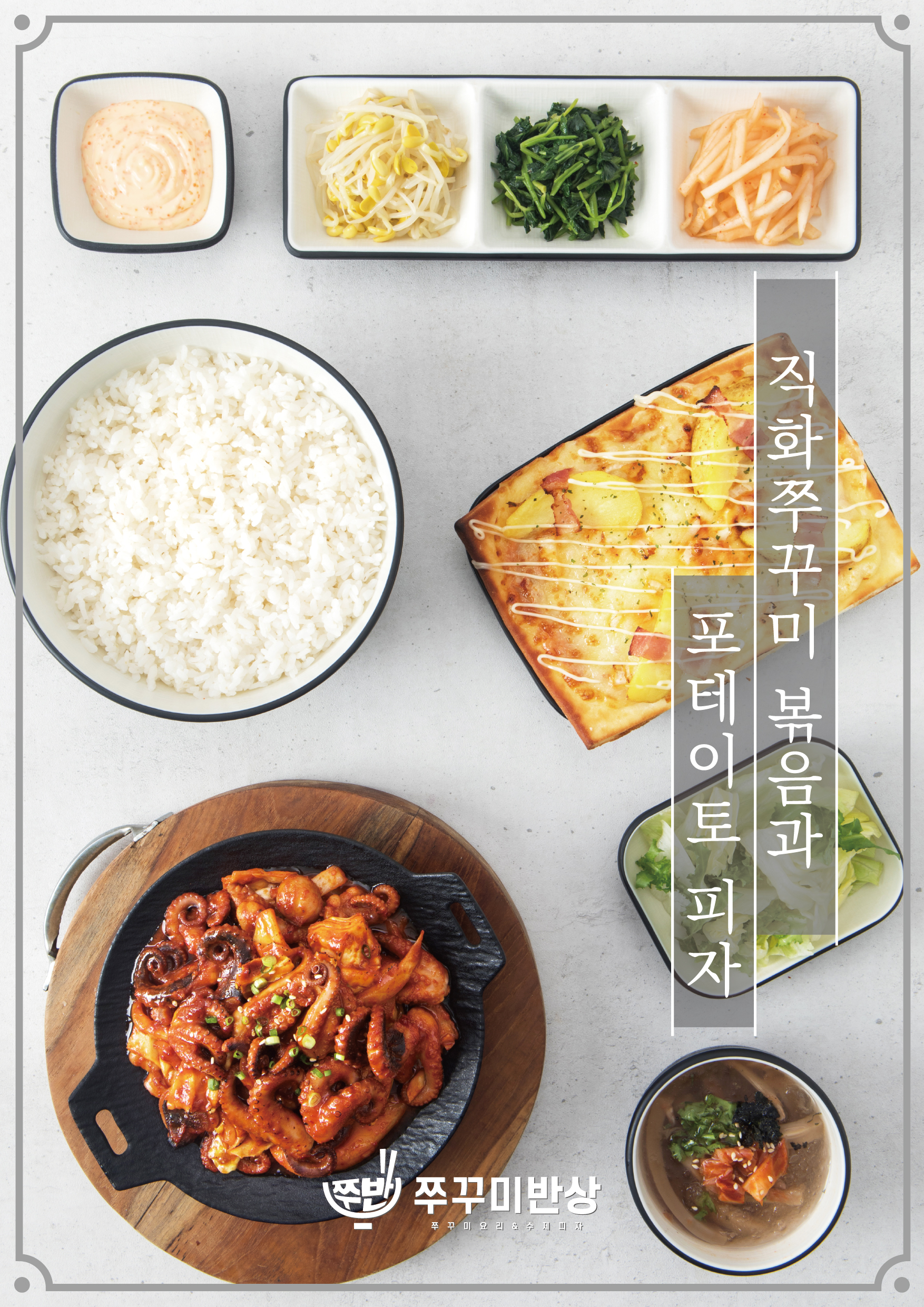 쭈꾸미 반상 15,000 | 쭈꾸미 피자 세트 20,000 | 어니언 돼지불백 반상 15,000 | 어니언 돼지불백 피자세트 20,000 | 쭈꾸미 삼겹 반상 16,000 | 쭈꾸미 삼겹 피자 세트 21,000 | 삼겹 반상 15,000 | 삼겹 피자 세트 20,000 | 쭈꾸미 비빔우동 14,000 | 쭈꾸미 비빔우동 피자세트 19,000 | 베이컨 크림우동 14,000 | 베이컨 크림우동 피자 세트 19,000 | 포테이토 피자 7,000 | 고르곤졸라 피자 7,000 | 페퍼로니 피자 7,000
