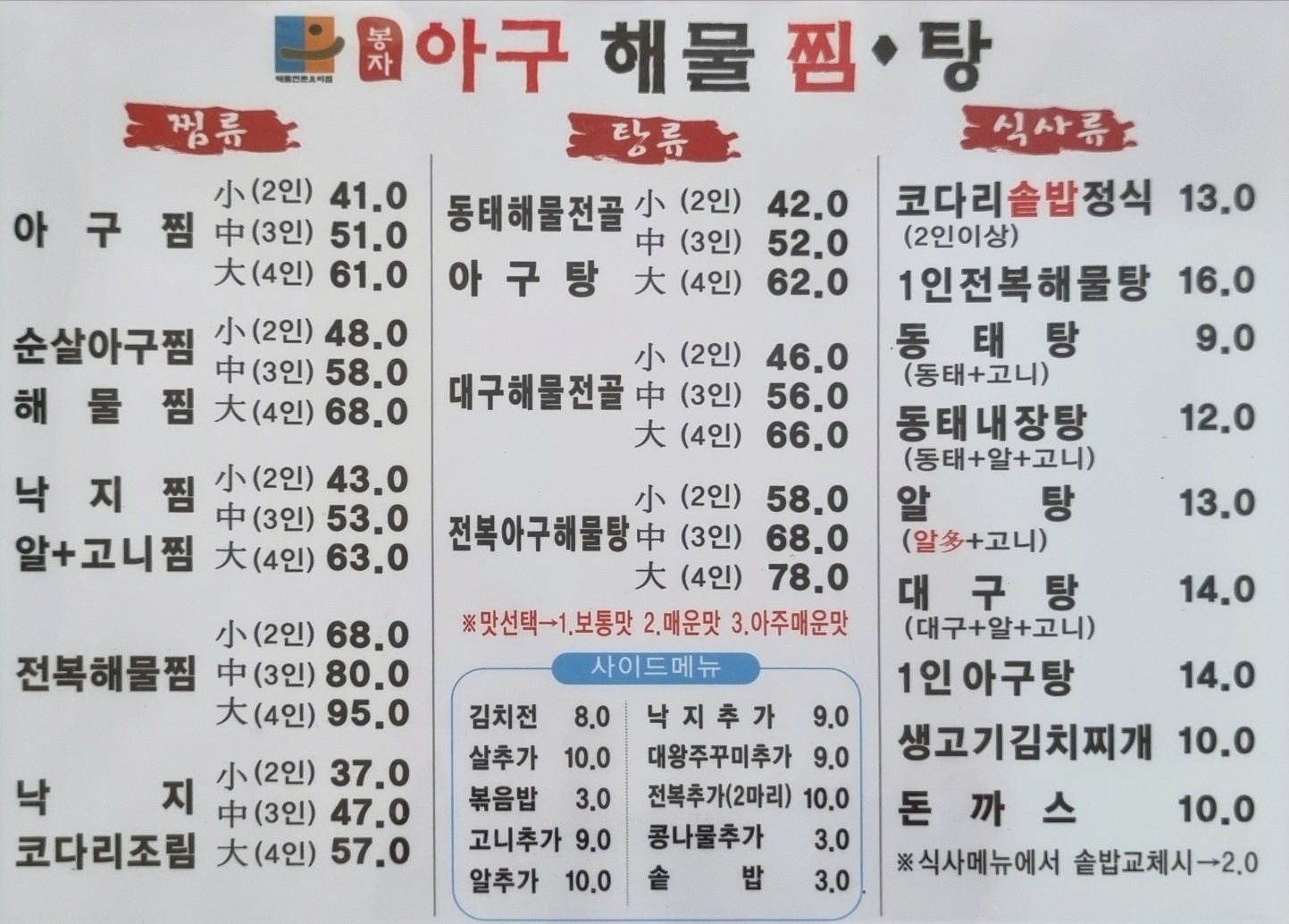 아구찜(소) 41,000 | 순살아구찜(소) 48,000 | 해물찜(소) 48,000 | 알+고니찜(소) 43,000 | 낙지찜(소) 43,000 | 동태내장탕 12,000 | 알탕 13,000 | 동태탕 10,000 | 코다리조림(소) 37,000 | 전복해물찜(소) 68,000