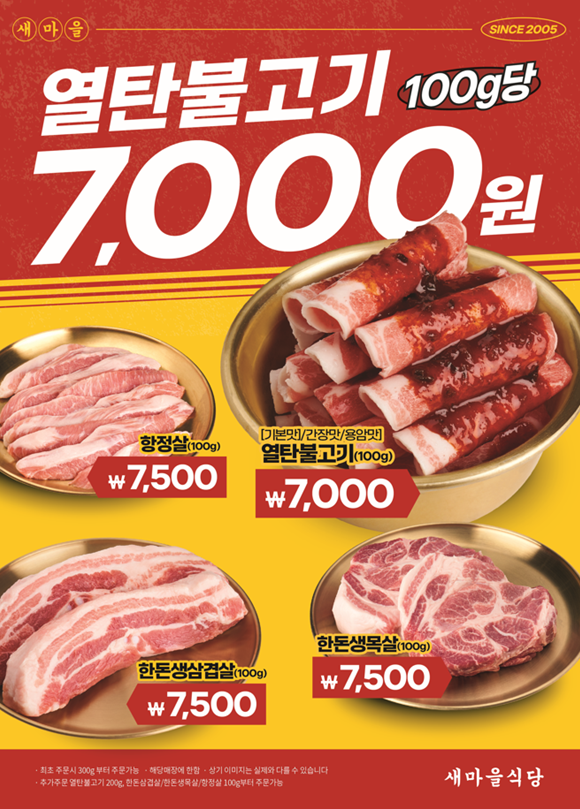 열탄불고기 100g 7,000 | 한돈생삼겹살 100g 7,500 | 한돈생목살 100g 7,500 | 항정살 100g 7,500 | 차돌박이 100g 13,000 | 훈제막창 100g 7,000 | 7분돼지김치 8,000 | 냉김치말이국수 6,000 | 껍데기 100g 4,000