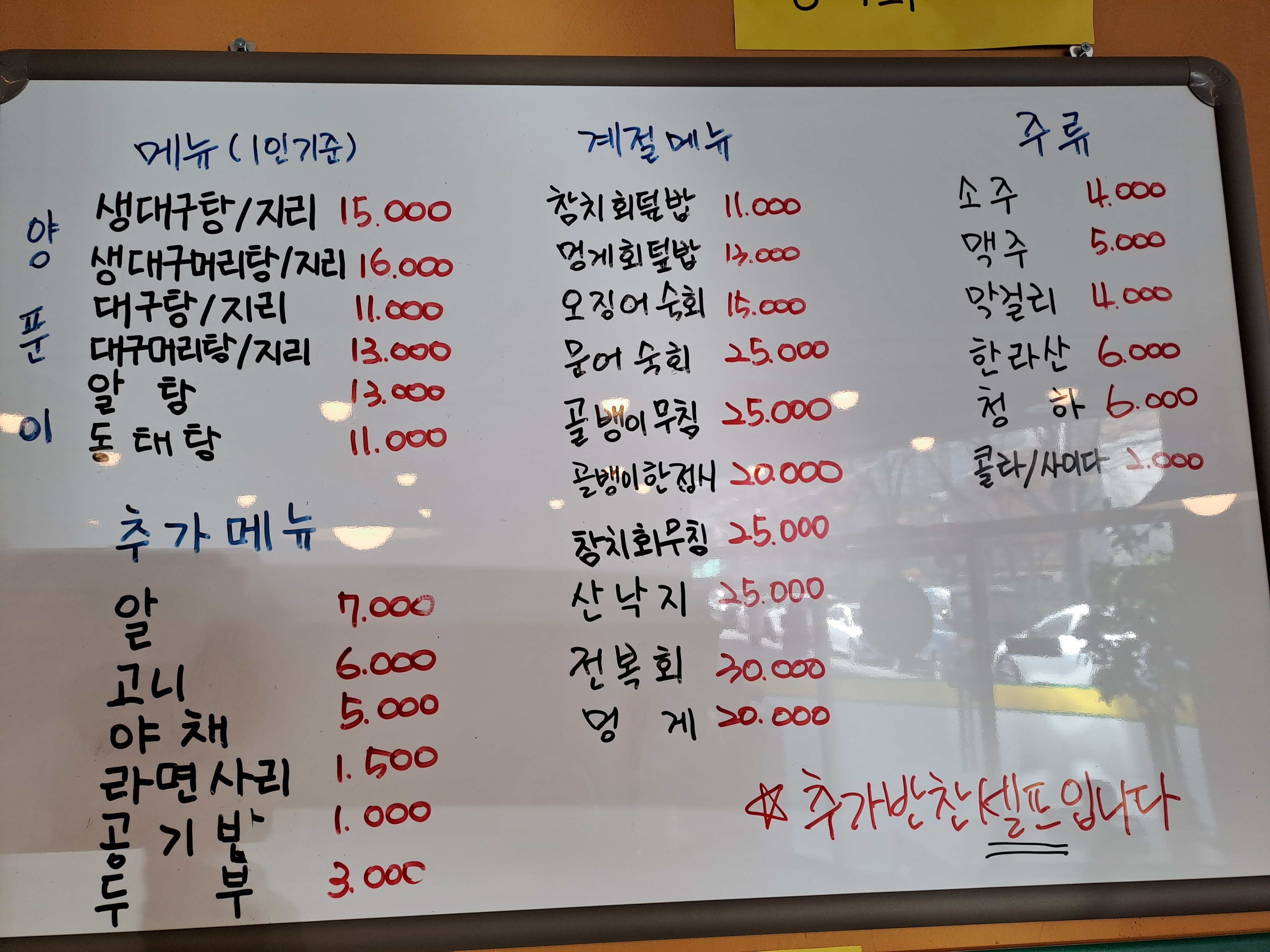 칼집생삼겹살(180g) 17,000 | 칼집생목살(180g) 17,000 | 뚝배기동태탕 11,000 | 콩나물해장국 9,000 | 오징어콩나물해장국 10,000 | 생고기뚝배기김치찌개 10,000 | 해물김치전 15,000 | 동태한마리전골 17,000 | 알, 고니 추가 13,000 | 뚝배기동태내장탕 13,000 | 생고기김치전골 11,000 | 뚝배기알탕 13,000 | 오징어숙회 15,000 | 제육쌈밥 11,000 | 돌솥비빔밥 10,000 | 명가비빔밥 9,000 | 제육덮밥 9,000 | 열무냉면 10,000 | 계란찜 6,000 | 된장찌개(후식) 5,000 | 직접눌린누룽지 5,000